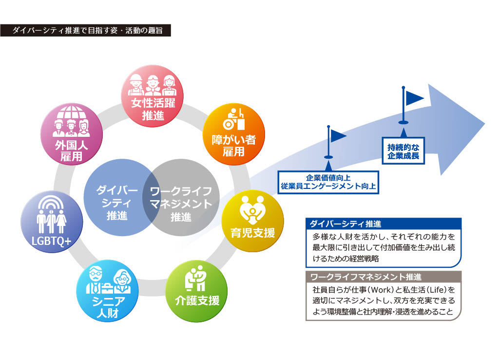ダイバーシティを推進し、企業価値・従業員エンゲージメントを向上し、社外ステークホルダーが『魅力に感じる』会社、社員が『働いて幸せに感じる』会社を目指します。